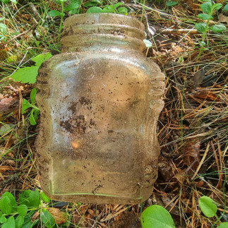 The next one I opened was an empty gasmask canister and after that I dug up a small pit filled with medical ampoules, bottles, cream tubes, a Norwegian porcelain plate and lots of large nails. Together with that was a nice little ashtray with "Nordkapp" and a viking ship stamped on, and an interesting small plastic tube to keep tablets in.