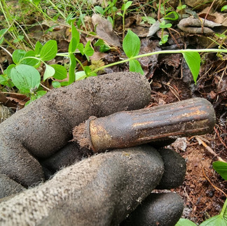 A few barrel bands and a small coil of wires got pulled loose from tiny roots. Fearing that those bits of metal were it I stuck the pin pointer down between the rocks that were under the top soil. It beeped and vibrated so I started prying loose the large rocks soldiers once had carried up from the nearby river and covered the pit with.