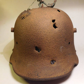 A bullet ridden german WW1 helmet picked up from the Ypres battlefields by a local farmer made its way to my workbench many years ago. I spent several weeks making the dramatic close combat scene in a british trench, and also placed LED lights inside the helmet. This was the first one of my helmet dioramas.