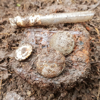 I freed the badge from the soil and noticed the enamel had a little damage and that the front plate was missing. That sucked, and it would be difficult to find the small flat part in this mud, but I was so excited by the find anyway. Then I looked down and saw the part laying there! It must have come out together with the food tin. Now I was even happier. I placed it in a safe spot and got back to searching.